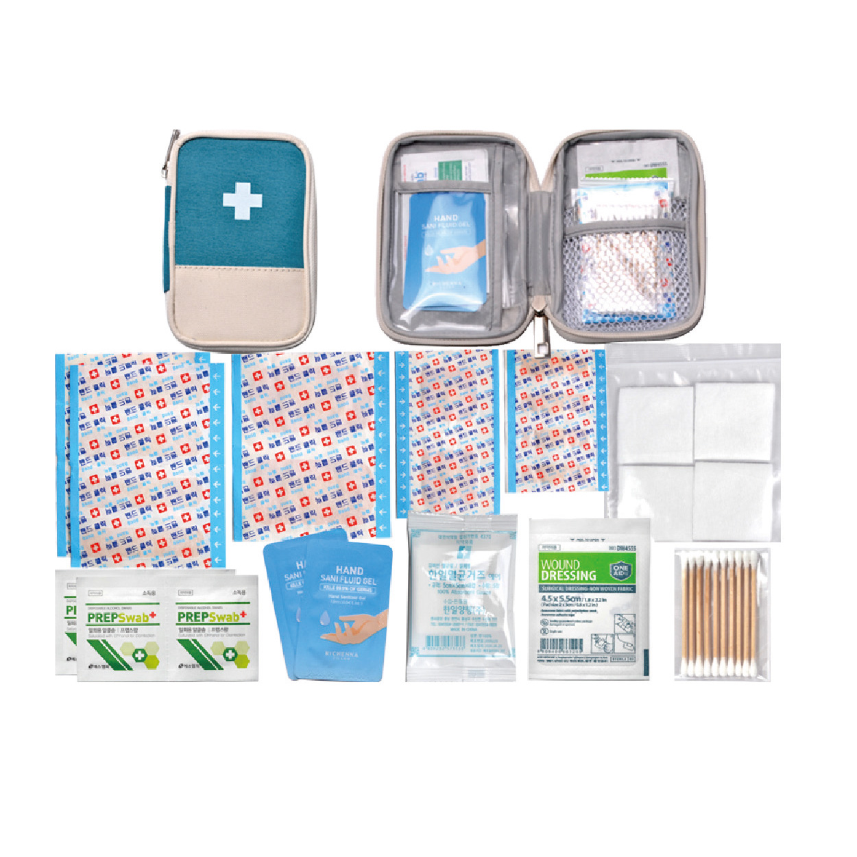 표준밴드8p/대형밴드2p/사각밴드2p/미니밴드4p/손소독제2p/알콜솜4p/ 드레싱밴드/멸균거즈5p/10p면봉/절솜4P/구급케이스 ※밴드이미지는 변경될수있음 / 종이케이스 포함
