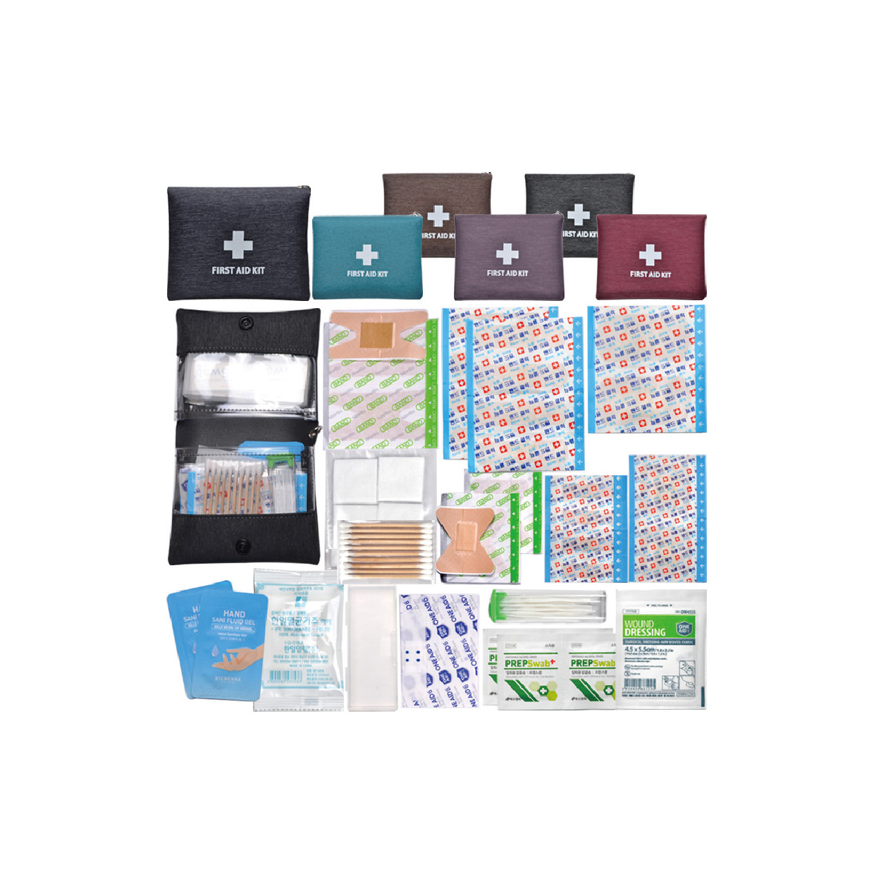 ※밴드이미지는 변경될수있음 / OPP포장포함 / 종이케이스비용은 별도 표준밴드8p/대형밴드2p/사각밴드2p/미니밴드4p/손끝밴드2p/관절밴드2p/ 방수밴드2p/알콜솜4p/드레싱밴드/멸균거즈5p/10p면봉/절솜4P/ 손소독제2P/15P치간칫솔/구급케이스