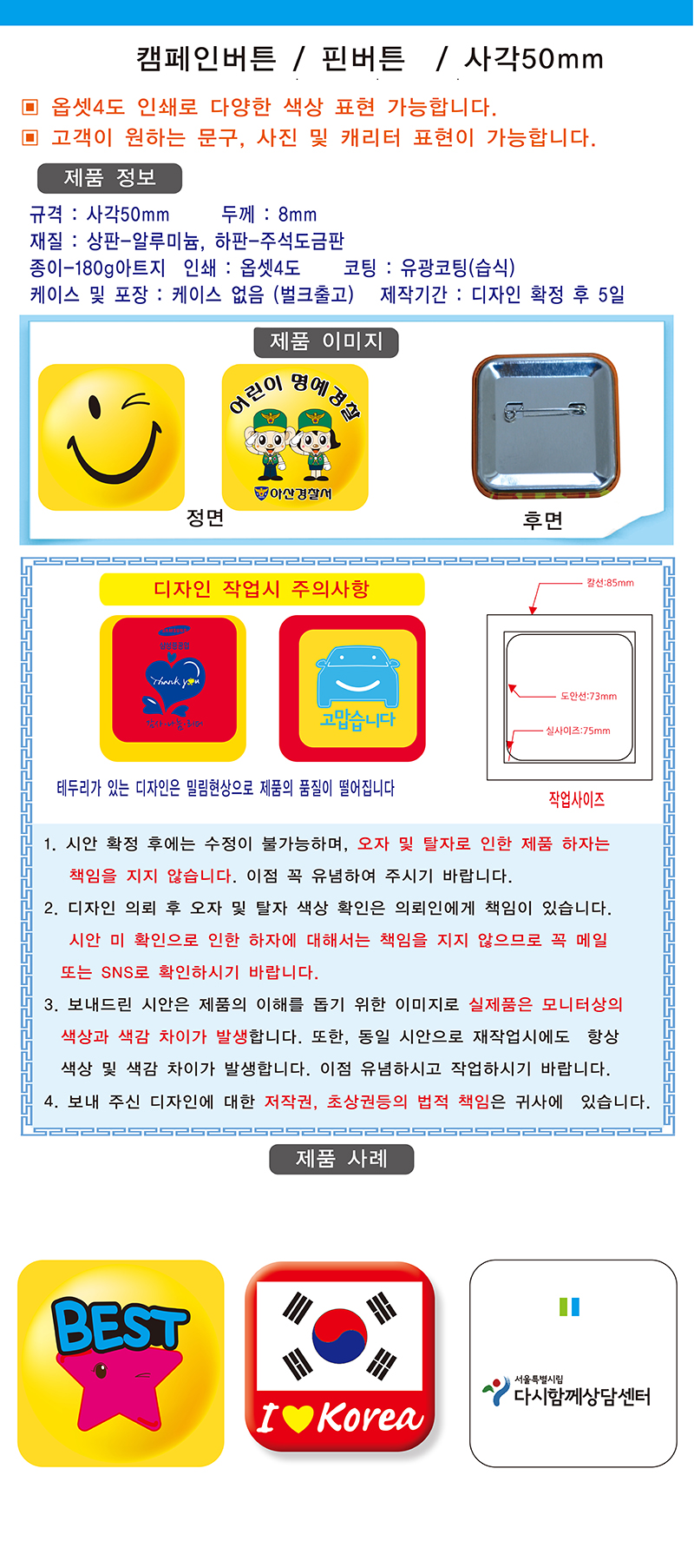 •1,000EA •기본수량 : 100EA •1,000개 이하 가격 별도 문의 •재질:철판/옵셋인쇄(유광코팅) •케이스 및 포장 : 케이스 없음(벌크출고) •제작기간:디자인 확정 후 5일
