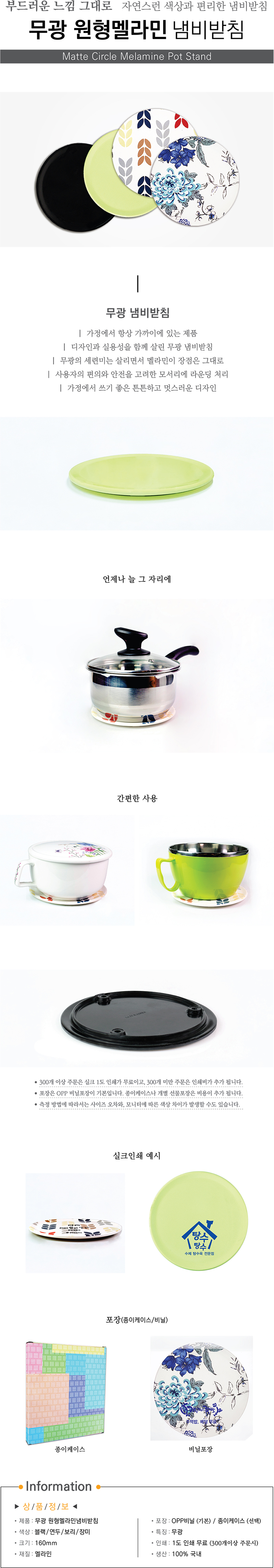 ※ 기본 OPP포장 기준(종이케이스 포장시 50원 추가) •Size : 160Ømm •무광 멜라민 냄비받침