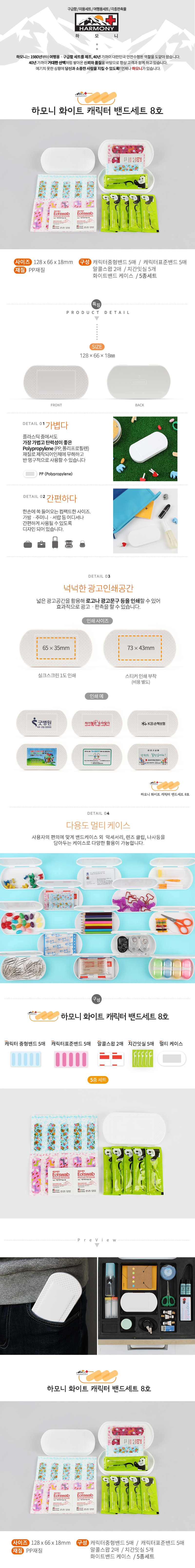 •수량 : 400EA •SIZE : 128x66x18 (mm) •스티커작업 별도 •캐릭터밴드 10매, 알콜스왑 2매, 치간잇실 5매 •1BOX : 400EA ※상품 내 모든 구성상품들은 수급상황에 따라 예고없이 변동 될 수 있습니다.