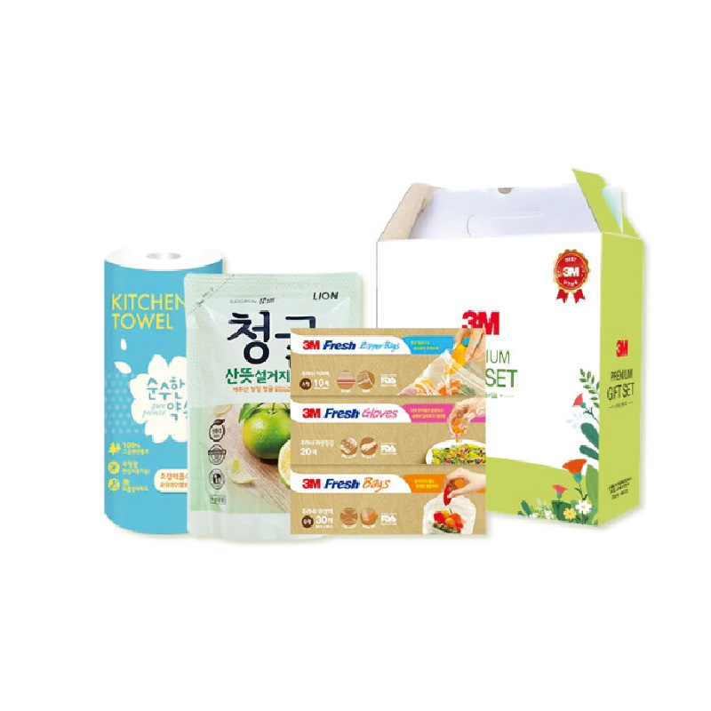 •Size : 240x242x96mm / 1Box : 20EA •3M 후레쉬 지퍼백 10매, 3M 후레쉬 장갑 20매 •3M 후레쉬 위생백 30매, LION 청귤 세제 300g 리필 •순수한 약속 키친타올 1롤(65매)