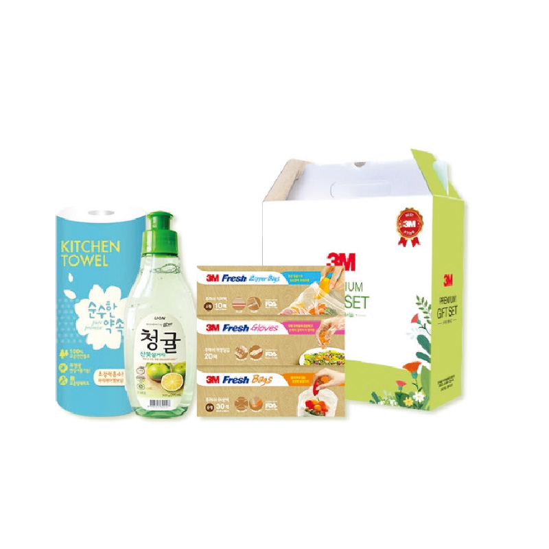 •Size:240x242x96 mm/1Box:20EA •3M 후레쉬 지퍼백 10매, 3M 후레쉬 장갑 20매 •3M 후레쉬 위생백 30매, LION 성글 세제 300g 용기 •순수한약속 키친타올 1롤 (65매)