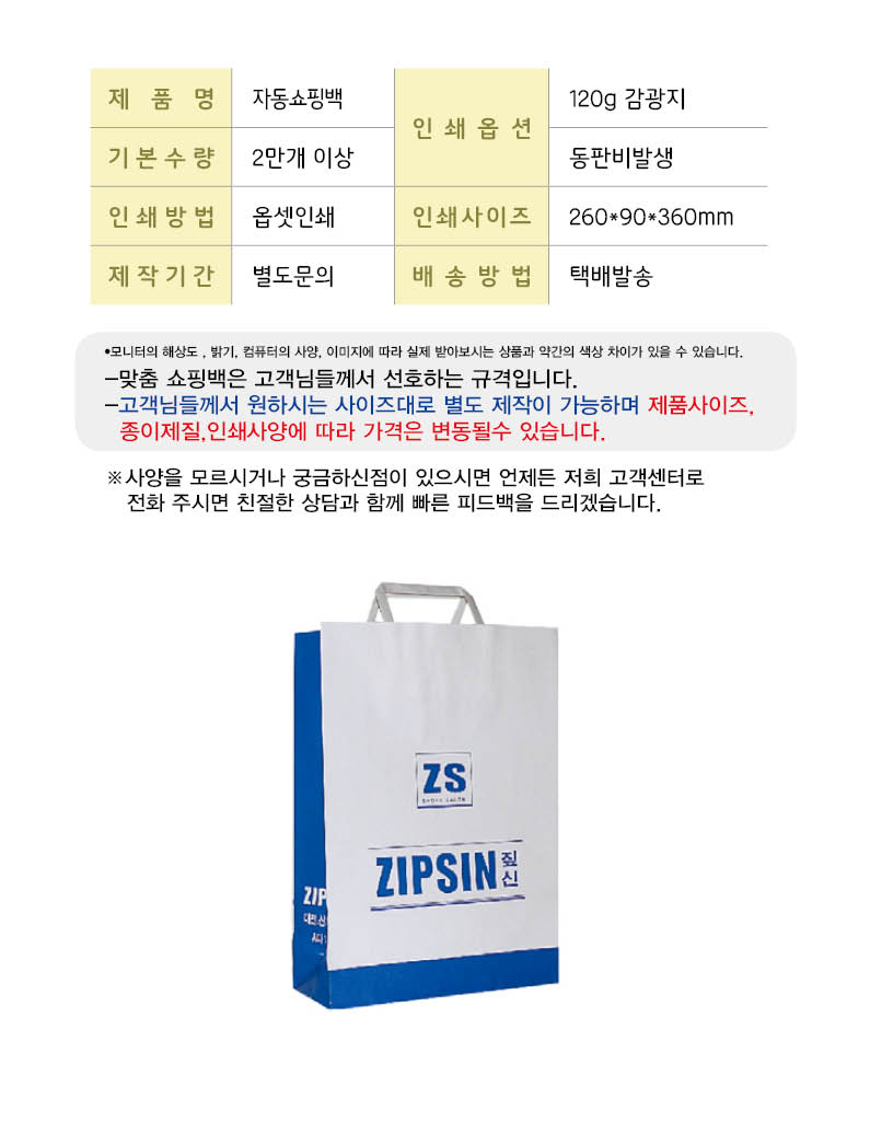 별도문의 •감광지 120g •기본수량 20,000개 이상 •Size : 260x90x360 mm •동판비 별도