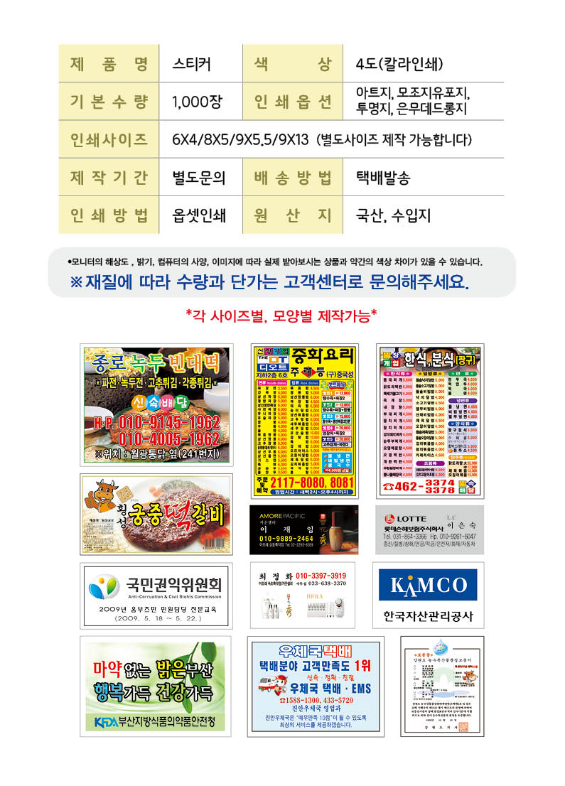 가격별도문의 •각 사이즈별, 모양별 제작가능(아트지, 모조지, 유포지, 은무데드롱지, 투명지)