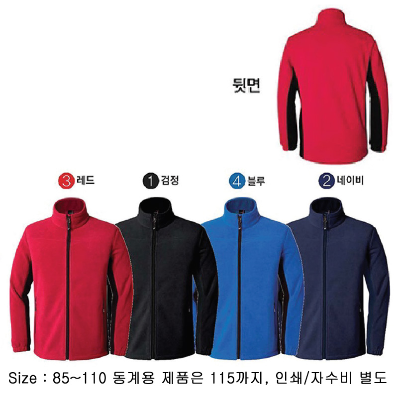 •폴리에스터 100%(저데니아 폴리스) ※아웃도어(바람막이,파카,패딩)/인쇄, 자수비별도/사이즈:85~110,동계용 제품은 115까지.